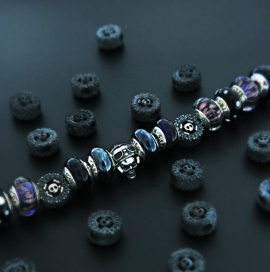 可先將骷髏頭放入安全帽中 (左右洞孔平行) 接著一併串入手鍊中!